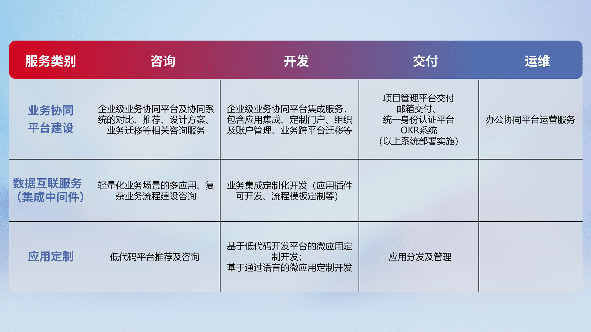 针对钉钉、、企微、、、、IDaas等平台级产品提供产品的规划、、、方案、、、交付、、定制化开发等服务,,实现如统一协同办公、、、智能客户服务、、、混合会议管理、、智能数据查询、、等业务场景,,,,实现数字化转型。。。